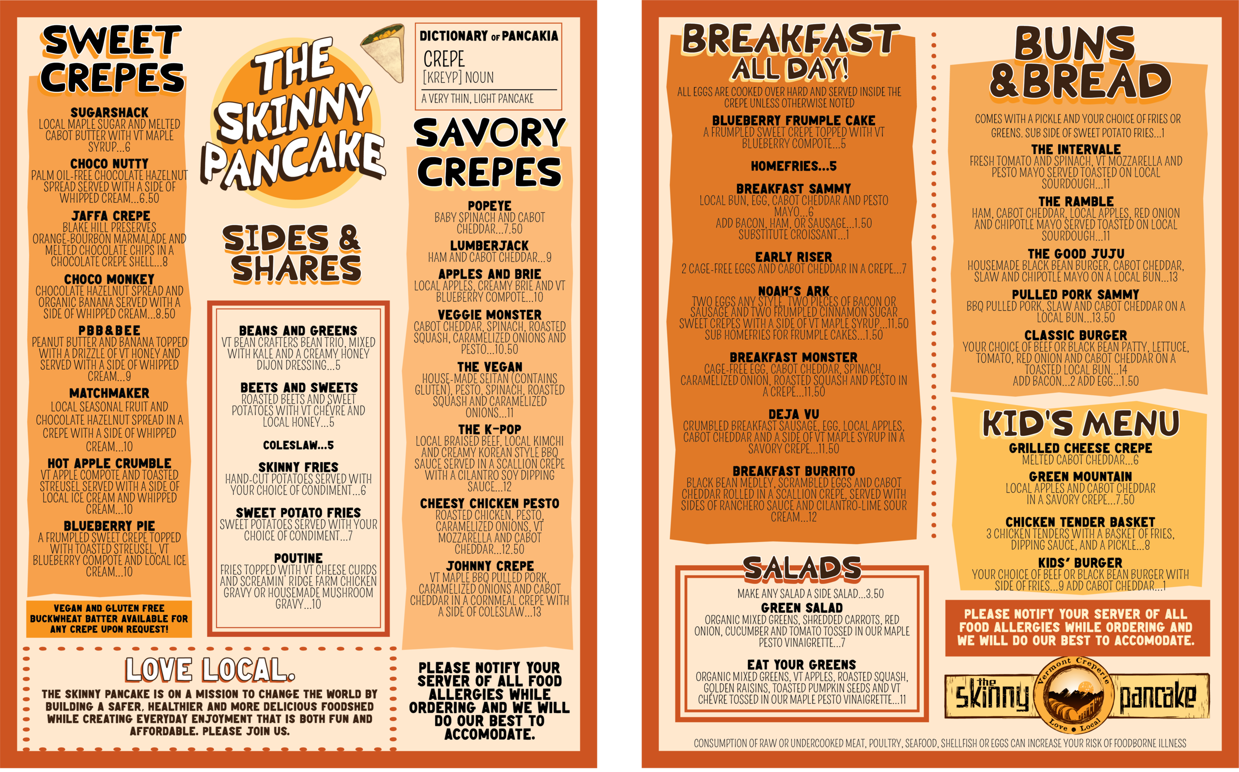 various social posts, menus, signage and print collateral created during my time as the in-house graphic designer at the skinny pancake